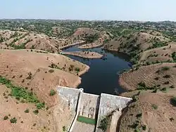 Dungarpur District lies in southern Rajasthan on the border with Gujarat. The district has an area of 3,770 km2[7] and had a population of 1,388,906 in 2011. The district is roughly triangular in shape.[8] The Mahi River runs along the southeastern edge of the district, forming the boundary with Banswara District. The Som River, a tributary of the Mahi, runs along the northern edge of the district, largely forming the boundary with Udaipur District. The district is bounded on the southeast by the districts of Sabarkantha, Panchmahal and Dahod of the state of Gujarat. The Vatrak River originates in Dungarpur District.[9]