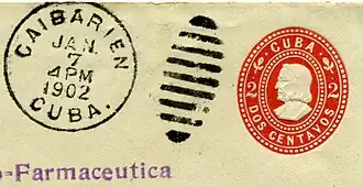 A duplex canceller was a hand stamp used to cancel postage stamps and imprint a dated postmark applied simultaneously with the one device.[1] The device had a steel die, generally circular, which printed the location of the cancel, together with the time and date of cancel. This die was held in place by a handle with an obliteration marker, often oval shaped, off to the right side that was applied over the postage stamp to prevent its reuse.[2] The ink came from an ink pad.
