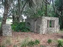 A 1948 American Automobile Association publication described the 900-acre estate as including "a beautiful 25-acre tropical garden with winding paths, meandering streams and sparkling waterfalls" and called it "one of Florida's major attractions".[2] The gardens were also featured in other late 1940s and early 1950s guides.[3][4][5] A historical marker, now located at the edge of a suburban housing development on Ehren Cutoff (Pasco CR 583), marks the original entrance of the road that once led to the 25-acre tropical botanical garden. The original stone ticket gate has been left standing.
