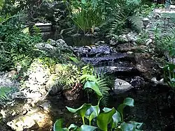 View of a waterfall separating 2 sections of the original Dupree Gardens ponds, restored to full functioning by Slaz & Laurence