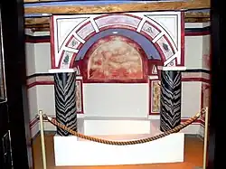 Only the baptistry was decorated with wall paintings, which distinguished the church from the nearby Jewish synagogue that featured artwork on display throughout. Scholars hypothesize that this difference stems from Christianity's desire to promote conversion at the time, which would only happen within the baptistry and give the convert the singular experience of witnessing the artworks when they were anointed.[35] The room's ceiling could be reconstructed using plaster fragments; it was painted in dark blue with bright stars.[36] The baptismal font was on the west side of the room, where there were a brick canopy with a vaulted ceiling and two pillars in the front. The pillars were painted dark green with black veins, probably to imitate marble. The front over the arch of the niche showed fruits in fields. The ceiling inside the niche was blue with bright stars.[37] Inside the niche was the baptismal pool. There are paintings on the back wall; the Good Shepherd was on the left[38] with a ram on his shoulders. The figure was about 40 cm (16 in) high. A flock of sheep was depicted in front of him, in the middle of the field and on the right. The number of sheep and rams cannot be determined today; it was probably once between thirteen and sixteen. The sheep on the far right are drinking water, although this part of the scene was in poor condition. The large number of sheep was atypical for comparable presentations. Under the Shepherd are Adam and Eve; both figures appearing to be a later addition. The whole picture was found to be poorly preserved and was found in fragments that had to be reassembled. It is uncertain whether the number of sheep had a symbolic meaning. The representation of the Good Shepherd was extremely popular in ancient times; it is always a picture of a young, beardless man in a short skirt carrying a sheep on his back.[39]