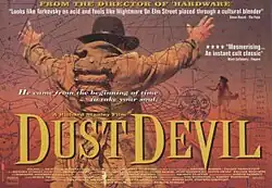 Dust Devil was financed by an amalgamation of British Investors under the Palace Productions umbrella.[9] The film also received some financial backing from Miramax, the distributors of Stanley's previous film Hardware.[9] In December 1991, Stanley delivered his first fine cut, a 120-minute assembly version that was cut to fulfill British television contracts.[9] This version was given to Miramax for their consideration who returned it as an 85-minute version.[9] In February 1992, Palace who was on the verge of financial collapse, asked Stanley to accept a cut that was a compromise between the original version and the Miramax edit.[9] Stanley mentioned that "Palace explained it would be financially expedient to arrive at a compromise but I'd have nothing to do with it. I'd lost footage already and I wasn't willing to go back in the editing room."[9] Dust Devil was initially set to be released in the United Kingdom in December 1992.[5] A 94-minute cut was test-screened in August 1992 to what Mark Kermode of Shivers magazine described as "a poor reaction."[9][6] A shortened version that was accepted by Miramax was shown in Spain and Portugal under the title Demonica and was also shown at the Avoriaz Film Festival.[9] Abridged versions were shown in Italy and France under different titles.[6] After Palace lost its money, Stanley persuaded Polygram to have a new version ready which he personally financed with £15,000.[9] On 7 April 1993, Dust Devil: The Final Cut premiered at the Scala cinema in King's Cross, London and was shown for one week and grossed £2,836, a few weeks prior to being released to home video.[9][10][2][6]