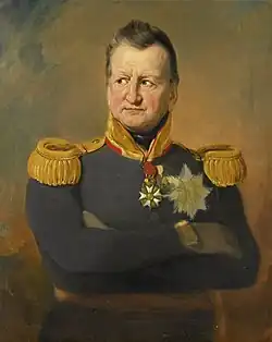 - ^ The rank of lieutenant-general was reintroduced for the rank of général de division on 16 May 1814, therefore after the coming to power of King Louis XVIII. This may explain a certain amount of confusion, as Chassé had already left French service by that time. Several French sources give the promotion as to "lieutenant-general" instead of général de division;Cf. C. Mullié, Biographie des célébrités militaires des armées de terre et de mer de 1789 à 1850, pp. 304–305 and Eugène Fieffé, Histoire des troupes étrangères au service de France depuis leur origine jusqu'à, nos jours, et de tous les régiments levés dans les pays conquis sous la première République et l'Empire: avec 32 gravures coloriées représentant plus de 80 types d'uniformes, Tome 2, Librairie Militaire Dumaine, 1854, p. 342, note 1. This may be explained as follows: the Dutch biographer of Chassé, Del Campo, writes: "Chassé traveled to Paris [in April 1814] to take care of his affairs and to ask to be released from French service. He was honorably discharged by the Minister for War, Marshal Soult, in a letter dated 6 December 1814, with the simultaneous promotion to the rank of lieutenant-general, and the expression of the highest satisfaction with the way he had served France"; Cf. Del Campo, p. 56.