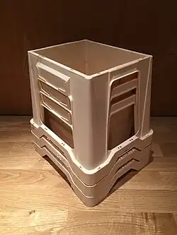 It is a patented design from Royal FloraHolland, a Dutch conglomerate of florists.[2] The bucket is made of hard plastic, making it stackable, and comes in three main sizes.