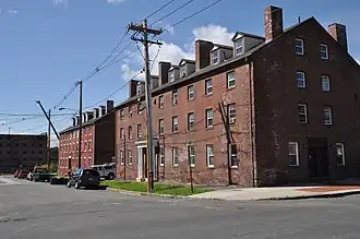 The Dwight Manufacturing Company Housing District is a residential historic district in Chicopee, Massachusetts. Roughly bounded by Front, Depot, Dwight, Exchange, and Chestnut Streets, it encompasses a variety of housing built for mill workers at Chicopee's mills during the 19th century. This cluster is one of few remnants of such housing, which was built on a larger scale now diminished by urban renewal.[2] The district was listed on the National Register of Historic Places in 1977.[1]