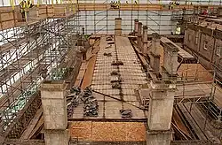 The Blathwayt family owned the house until 1956, when the government acquired it. During the Second World War it was used for child evacuees while rented by Anne, Baroness Islington, the widow of John Dickson-Poynder, 1st Baron Islington (1866-1936), a former Governor of New Zealand. Lady Islington redecorated many of the rooms.[10][11] The National Trust acquired it in 1961.[12] In 2015, major renovation work included replacing the roof. Part of the cost was met from a Heritage Lottery Fund grant of £85,000.[12] While the repairs were in progress, visitors could view the house from a rooftop walkway.[13][14] In 2020, the National Trust published a report which examined the connections of its properties to the British Empire. The report's authors noted that Dyrham Park was owned by several individuals who were involved in administering colonies, including Blathwayt, who was a prominent official in the Southern Department.[15][16]