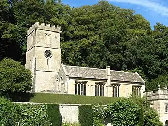 The Anglican parish church of St Peter was originally built in the mid 13th century and had a three-stage tower added in the 15th, however it was extensively restored when the main house was built in the late 17th century. The church consists of a north and south aisle, chancel and south west porch with the tower to the west.[26] In the south aisle are encaustic tiles dating from the 13th century.[27] The font is Norman while the pulpit is Jacobean. There is also a 16th-century Flemish altar triptych.[26]