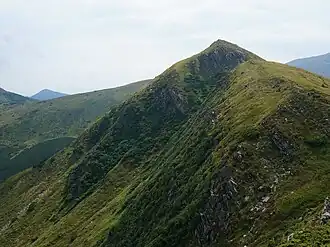 Dzembronia (Ukrainian: Дземброня) is a 1,877-metre (6,158 ft) peak located in the Chornohora (Чорногора) mountain range of Carpathian Mountains in western Ukraine. It is situated on the border of the Ivano-Frankivsk and Zakarpattia Oblast.