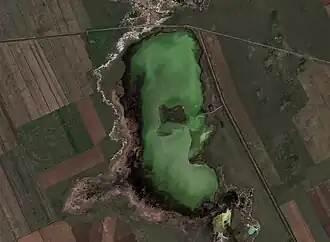 The lake is surrounded by flat steppe landscape and cultivated fields.[4]