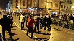 Following the altercation, 300 people surrounded the Kebab Bar.[6][3] Initial media reports stated that Rudnicki was a random victim and not a thief chased by shop workers.[7] Dozens of angry locals outraged by the slaying, chanted anti-foreigner slogans,[3] smashed Prince Kebab's window and at least one firecracker, rocks, bottles and paving stones were thrown at the restaurant.[3][4][5] The police used pepper spray and arrested 28 people.[6] The day following the riots, activists from the far-right National Radical Camp (ONR) came to Ełk, employing the slogan "Ełk free from jihad".[5] Smaller incidents also took place in several other municipalities.[8]