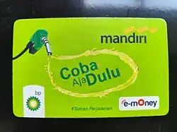 e-toll or e-toll card, now officially as Mandiri e-money, is an Indonesian contactless smart card used by toll road drivers to pay the toll fee. The card is issued by Bank Mandiri in cooperation with 3 toll operators (PT Jasa Marga Tbk, PT Citra Marga Nusaphala Persada Tbk and PT Marga Mandala Sakti).[1] This card used the RFID system.