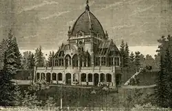 Schwagerl's first commission in the Pacific Northwest came while he was still working in Cleveland, when banker Henry Failing commissioned him in mid-1879 to design River View Cemetery in Portland, Oregon, designs for which Schwagerl finished by that December. In addition to laying out the cemetery grounds, he designed several buildings, including a chapel and receiving vault (pictured), but these were never built. The cemetery design was favorably received, with one review calling it "the most beautiful cemetery on the Pacific Coast."[5] Schwagerl returned to Cleveland after a further proposal to lay out the grounds of City Park (now Washington Park) was not accepted.[22]