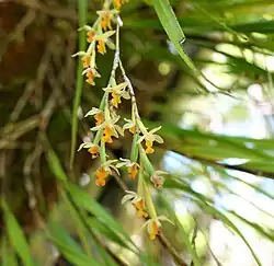 Earina aestivalis, commonly known as bamboo orchid or summer earina, is a species of pendent orchid that is endemic to New Zealand.[2][3][4] The specific epithet, aestivalis, is derived from Latin and means "pertaining to the summer".[5]