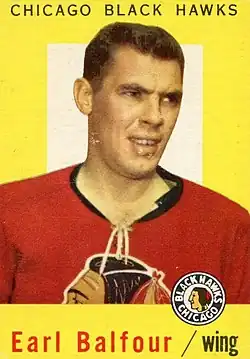 Earl Frederick "Spider" Balfour (January 4, 1933 – April 27, 2018) was a Canadian ice hockey player. He played in the National Hockey League from 1952 to 1961 with the Toronto Maple Leafs and Chicago Black Hawks. He was a defensive forward and penalty-killing expert. Balfour won the Stanley Cup with Chicago in 1961. He retired after 288 games, posting 30 goals, 22 assists, 52 points and just 78 penalty minutes. He died April 27, 2018, after having lived in the Cambridge, Ontario area.[1]