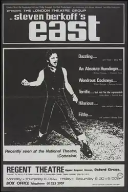 ![]() Poster advertising The London Theatre Group's 1977 production of East at the Regent Theatre, London. | |