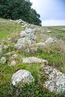 The East Bay Walls, also known as the Berkeley Mystery Walls, are a misnomer, as many such walls can be found throughout the hills surrounding the San Francisco Bay Area, and extend as far as Chico, Red Bluff and Montague. In places, they are up to a meter high and a meter wide and are built without mortar.[1] The walls extend anywhere from a few meters to over a half mile. Materials range in size from basketball-size to sandstone boulders weighing a ton or more. Parts of the wall seem to be just piles of rocks, while other walls were carefully constructed. The exact age of the walls is unknown. Many formations have sunk far into the earth, and are often completely overgrown.