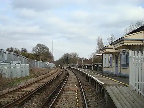On the southbound platform is a signal box which remains to control the level crossing. The old ticket office, located in a wooden building on the southbound platform, closed in 1989; this was APTIS-equipped from 1987 until closure. This building then remained disused for many years though in good condition. In 2007, a PERTIS permit to travel ticket machine was installed at the entrance to the southbound platform, which is behind the signal box.