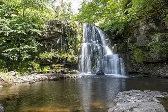 East Gill Force is a waterfall in Swaledale, 330 yards (300 m) east of the hamlet of Keld, in the Yorkshire Dales National Park, North Yorkshire, England.[1] The falls are located on East Gill at grid reference NY896012, just before its confluence with the River Swale at the point where the Pennine Way and the Coast to Coast Walk intersect. The falls are a popular spot for visitors, not just long-distance walkers but also families and picnickers because of the proximity of the road. East Gill Force has two main torrents: the upper falls have an impressive 15-foot (4.5 m) drop whilst the lower section is a series of stepped cascades that fall 9.8 feet (3 m) as East Gill enters the River Swale.