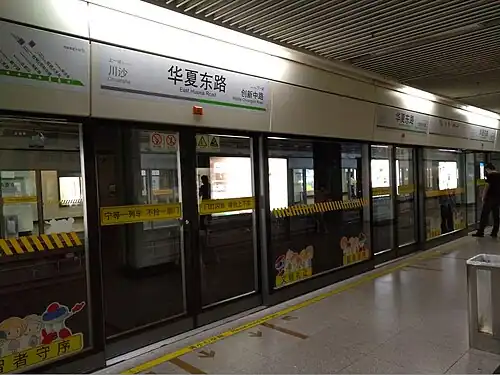 East Huaxia Road (simplified Chinese: 华夏东路; traditional Chinese: 華夏東路; pinyin: Huáxià Dōng Lù) is a station on Line 2 of the Shanghai Metro. Located along the Huaxia Elevated Road, it is between the Middle Chuangxin Road and Chuansha stations on Line 2. It came into operation on April 8, 2010 as part of an eastward extension from Guanglan Road to Pudong International Airport.