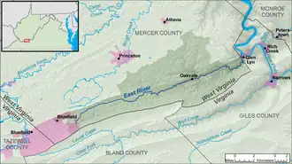The East River was named for its easterly course.[5] It rises from East River Mountain in Mercer County, West Virginia, in the eastern part of the city of Bluefield, and flows generally east-northeastward through southern Mercer County, generally in parallel to East River Mountain to its south, through the unincorporated communities of Ada, Ingleside, and Hardy; the town of Oakvale; and the unincorporated communities of Kellysville and Willowton. It flows into the New River soon after entering Virginia, in the town of Glen Lyn in Giles County. The stream is paralleled for much of its course upstream of Oakvale by West Virginia Route 112, and downstream of Oakvale by U.S. Route 460.[6]