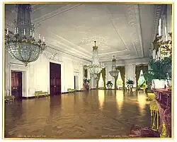 Jefferson's successor, James Madison, sought to make the partitions permanent and asked Latrobe to design bedrooms and office space across the southern part of the room. But these changes were not made, either.[13] Madison did use a portion of the East Room, however, for Cabinet meetings.[14]