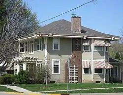 • The Holtan house at 1004 E. Main Street is a Prairie School-style house. The Holtans built a house here in 1896, but it was probably rebuilt or extensively remodeled around 1911 to a style then current. Typical of Prairie school is the horizontal emphasis in the wide, flared eaves. Unusual is the decorated fascia on the eaves. John Holtan managed the American Cigar Company, and served mayor and president of the First National Bank of Stoughton.[3][4]