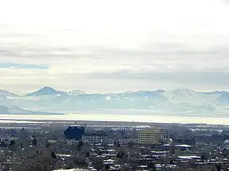 ![]() NE flank of range & Utah Lake from Provo "County Line Ridge" and peaks (overlooking Utah Valley, & Goshen Valley, West Mountain (Utah County, Utah) at photo left) | |