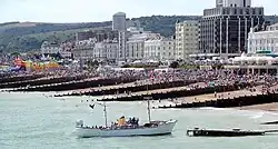The Second World War saw a change in fortunes.[32] Initially, children were evacuated to Eastbourne on the assumption that they would be safe from German bombs, but soon they had to be evacuated again because after the fall of France in June 1940 it was anticipated that the town would lie in an invasion zone.[33] Part of Operation Sea Lion, the German invasion plan, envisaged landings at Eastbourne.[34] Many people sought safety away from the coast and shut up their houses.[32] Restrictions on visitors forced the closure of most hotels, and private boarding schools moved away.[32] Many of these empty buildings were later taken over by the services.[32] The Royal Navy set up an underwater weapons school,[35] and the Royal Air Force operated radar stations at Beachy Head[23] and on the marshes near Pevensey.[36] Thousands of Canadian soldiers were billeted in and around Eastbourne from July 1941 to the run-up to D-Day.[32] Units of the very secretive and highly effective No. 3 (Jewish) Troop of the No. 10 Commando, composed of native German-speaking Austrian and German Jewish refugees, trained in Eastbourne.[37] The town suffered badly during the war, with many Victorian and Edwardian buildings damaged or destroyed by air raids. Indeed, by the end of the conflict it was designated by the Home Office to have been 'the most raided town in the South East region'.[38] The situation was especially bad between May 1942 and June 1943 with hit–and–run raids from fighter–bombers based in northern France.[39] Ultimately, 187 civilian people died in the borough through enemy action.[40]