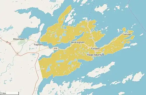 The Eastport Peninsula is a small extension of land into the central part of Bonavista Bay in the Canadian province of Newfoundland and Labrador. The peninsula is adjacent to Terra Nova National Park and contains seven small communities: Eastport, Happy Adventure, Sandy Cove, Salvage, St. Chad's, Burnside and Sandringham.