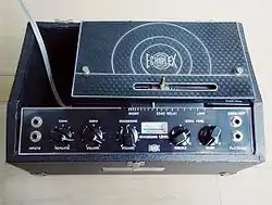 Tape echoes work by recording sound on a magnetic tape, which is then played back; the tape speed and distance between the recording and playback heads determine the delay time, while a feedback variable (where the delayed sound is fed back into the input) allows for multiple echoes.[3] The predecessor of the Echoplex was a tape echo designed by Ray Butts in the 1950s, who built it into a guitar amplifier called the EchoSonic. Butts built fewer than seventy EchoSonics for guitarists including Chet Atkins, Scotty Moore, and Carl Perkins.[4] Mike Battle later copied Butts' tape echo and built it into a portable unit;[5] another version of the story holds that Battle based his design on one by Don Dixon.[2]