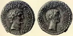 Silver denarius of the Second Triumvirate: 41 BC. Octavian (right, obv.); Antony (left, rev.)