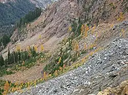 The mid-elevation forests in the North Cascades with an elevation between 2,000 and 4,300 feet (600 and 1,300 m) is the Silver Fir Ecoregion.[6] The Silver Fir Ecoregion makes up for much of the valleys in the Alpine Lakes area. The average annual temperature in this ecoregion is 42 °F (6 °C) and the average precipitation in centimeters is between 220 and 280 centimetres (87 and 110 in).[8] Typical montane forests in this ecoregion is dominated by Pacific silver fir and also contains noble fir, Douglas fir, and Alaska yellow-cedar.[6][8] Coarse woody debris is very characteristic of the Silver Fir Ecoregion, providing microsites for organisms. The Pacific silver fir zone is in some of the steepest parts of the topography and heavy snow often leads to avalanche gullies.[6] In every major drainage basin along the western slopes of the Cascade Mountains there is evidence of avalanche tracks breaking up the forested vegetation with nonforested vegetation.[6] These gullies provide sites of new successional growth as they move toward a coniferous forest again.[6] Because of the dense forests of the Silver Fir Ecoregion, it was the preferred area for commercial logging prior to designation of areas as wilderness.