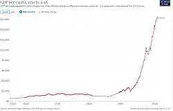 Mexican per capita income had fallen during the period 1800 until sometime in the 1860s, but began recovering during the Restored Republic. However, it was during the Porfiriato (the rule of General and President Porfirio Díaz (1876–1911)) that per capita incomes climbed, finally reaching again the level of the late colonial era. "Between 1877 and 1910 national income per capita grew at an annual rate of 2.3 percent—extremely rapid growth by world standards, so fast indeed that per capita income more than doubled in thirty-three years."[85]