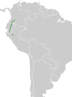 The Ecuadorian tyrannulet has a disjunct distribution. One population is found from Cauca and Huila departments in southwestern Colombia south along the eastern slope of the Andes for nearly the entire length of Ecuador and possibly slightly into northwestern Peru. The other population is found in the upper valley of the Mayo River near the border of northern Peru's San Martín and Amazonas departments. The species inhabits humid montane forest where it usually is found in the canopy and on the edges. In elevation it occurs between 800 and 1,200 m (2,600 and 3,900 ft) in Colombia, mostly between 700 and 1,400 m (2,300 and 4,600 ft) in Ecuador, and between 800 and 1,500 m (2,600 and 4,900 ft) in Peru.[5][6][7][8]