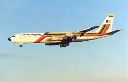 In the 1970s, most South American national airlines were operated by national air forces. Through the Defence Ministry, the Ecuadorian Air Force bought two refurbished Boeing 707s for the airline from Israeli Aircraft Industries in a deal worth US$4,700,000 (equivalent to $29,966,464 in 2024) million.[6] Ecuatoriana also acquired a Douglas DC-10 from Swissair and opened non-stop routes to Canada. Having jet equipment meant that long flights with stopovers were no longer necessary, and non-stop routes were opened all over South America and to other North American cities.