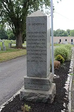 Jerome Bacon, an instructor at the Institute for Colored Youth (the precursor to Cheyney University), led efforts to create a cemetery for African-Americans who had been buried in cemeteries in Philadelphia that were being condemned by the city in the early 20th century.[5] The cemeteries included Lebanon Cemetery (condemned in 1899 – closed in 1903),[6] the Olive Graveyard (closed in 1923),[7] the Stephen Smith Home for the Aged and Infirm Colored Person's Burial Ground and the First African Baptist Church Burial Grounds.[4] The bodies buried in these cemeteries were disinterred and re-interred at Eden Cemetery.[8] The oldest reburial in the cemetery is from 1721.[9]