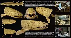 The holotype consists of numerous semi-articulated remains, including an incomplete skull roof, snout, palate, cheeks, lower jaws and associated dermal bones, a left shoulder girdle, and assorted scales. Reconstructions suggest a skull length of 30 cm (12 in) and lower jaw length of about 48 cm (19 in). The endoskeleton shows a large or complete lack of ossification. The orbits (eye-sockets) are somewhat triangular rather than oval-shaped. Edenopteron possessed dentary fangs and premaxillary tusks, which are presumed to be derived traits for other large tristichopterids. By comparison to body size ratios of other tristichopterid fishes (e.g. Eusthenodon, Langlieria, Mandageria), the body length of Edenopteron is estimated at 2.9—3.2 m (9.5—10.5 ft), while study in 2023 estimates length up to 3 metres (9.8 ft).[1][2] Additional fossil material may be described in the future: according to lead researcher Gavin Young, quoted in the Canberra Times: "We know that part of the pectoral girdle is still in the rock, so if we can lift up a few more blocks, we might find that the body is actually preserved in the rock."[3]