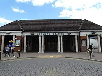 The station is in Station Road, Edgware (part of the A5100). This road runs north-east from the High Street (A5), and the station is about 500 metres from the A5 on the right (south-east) side. The building is set back from the road, and there is a circular service road between the building and the road to allow cars to pull in and pick up or set down.
