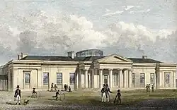 The origin of Edinburgh Accies can be traced back to before the club was officially formed to the establishment of the Edinburgh Academy in 1824. Cricket was played at the academy almost as soon as it was open in the "Yards" which surround the main school building. T.H. Shepherd's drawing of "The New Academy" (1828), shows two boys holding cricket bats. One of the boys in the drawing was William Moncreiff, who joined the school on its opening day[1] and was one of the founders of The Grange Cricket Club in 1832.[2]