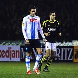 In July 2010, Cavani signed for Napoli. The transfer, however, was a loan of €5 million plus an option/obligation to buy outright for €12 million,[17][18] which made the total fee €17 million.[19] After debuting for Napoli as a substitute in the previous game, Cavani scored twice in his first start, as Napoli beat Elfsborg in the UEFA Europa League 2–0 and qualified for the main tournament. He then started his Serie A tenure with Napoli scoring a controversial goal against Fiorentina after just seven minutes, with replays showing the ball landing on the line. Cavani also scored on his home debut against Bari before adding a late winner against Sampdoria, meaning he had scored in his first four competitive matches with Napoli.