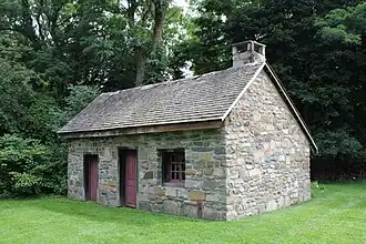 The family lived in the log cabin until 1755 when the first 2-story stone house was built, followed soon after with a 2-story stone addition. Built in 1755 by Edmonston, it is said that the house was used as a headquarters during the last years of the Revolutionary War by generals Horatio Gates and Arthur St. Clair and also served as the medical staff headquarters for the nearby encampment of the Continental Army.[2] However historian Edward Manning Ruttenbur asserts that the medical staff was headquartered at the James Clinton house in New Windsor village,[3] while the officers were billeted in a building across the road from the Edmonston house.[4]