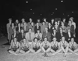 The Grads retained their amateur status to make sure they would be eligible for the Olympics if basketball was made an official Olympic sport.[12] In 1924, the Grads were invited to play at the summer Olympic games in Paris.[13] They won every game, defeating women's teams from Paris, Roubaix, Strasbourg and Lille with an average score of 60–10.[14] After their final match, the team traveled through Europe on holiday. Page and two of his players — Winnie Martin and Daisy Johnson — returned to Paris for the third congress of the Fédération Sportive Féminine Internationale (International Women's Sports Federation). The federation formally admitted Canada as a member and declared the Grads world basketball champions, permitting the team to hold the title until the next world games.[15]