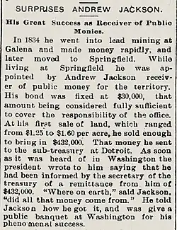 In 1835, he was appointed by President Andrew Jackson as Receiver of Public Moneys in Chicago, where he was in charge of substantial sales of federal land.[1] After holding this position for four years, he returned to the private sector. He continued to play a leading role in Democratic Party politics in Illinois.[6]
