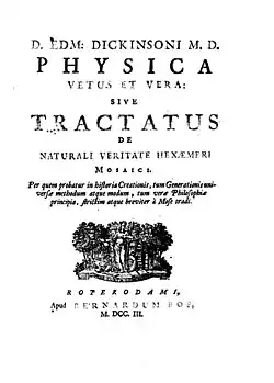 Later Dickinson published his notions of alchemy, in Epistola ad T. Mundanum de Quintessentia Philosophorum, Oxford. 1686. The major work on which he spent his latest years was a system of philosophy, set forth in Physica vetus et vera (1702). He established a philosophy founded on principles collected out of the Pentateuch, in which he mixed ideas on the atomic theory with passages from Greek and Latin writers as well as from the Bible. The book attracted attention, and was published in Rotterdam (1703), and in Leoburg (1705). Cotton Mather drew on Dickinson's thinking in his Biblia Americana.[6]