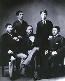 Edmund Gutmann (on the left seat) with his brothers Vilim, Isidor (both sitting), Ladislav and Alfred (both standing).