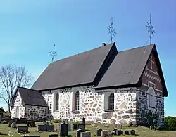 The oldest part of the church is the nave, which was built in fieldstone during the 13th century. The sacristy was added during the 14th century and the choir was enlarged, with added details in Brick Gothic style, during the 15th century. Unusually, the church has preserved its northern wall without windows. Most medieval churches in the area originally lacked windows in their northern façade, but normally windows were opened during the subsequent centuries. Northwest of the church stands the bell tower which was erected in the middle of the 17th century. The interior is decorated with frescos added in the 17th century. They were paid for by the Lilliesparre family, owner of nearby Kragsta Manor. Among the church fittings is the 13th century baptismal font of sandstone with a base of limestone. [2]