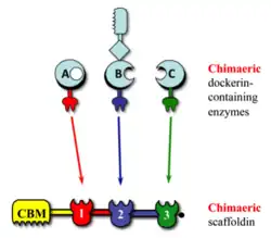Designer cellulosome technology enables the precise incorporation of dockerin-containing enzymes into the scaffoldin subunit. Schematic representation of a trivalent designer cellulosome. The chimaeric enzymes bind to the divergent cohesins according to their specificity allowing control of the stoichiometric ratio and enzyme location.
