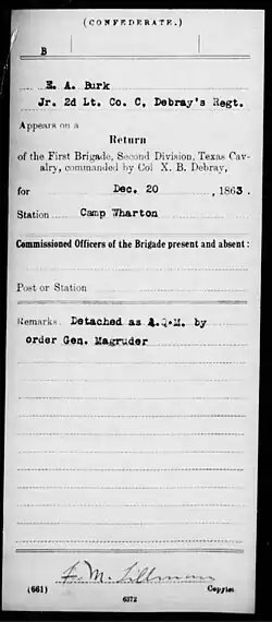 Burke, by his own account, was of Irish descent and born in Louisville, Kentucky. He used the name "Burk" until after the Civil War. Burk's initial career started with the railroads. At the age of thirteen he was employed as a railroad telegraph operator in Urbana, Illinois. By the age of seventeen, he had been promoted to a division superintendent.[1] The outbreak of the Civil War found Burke working for a railroad in Texas. On October 7, 1861, he was commissioned as a Confederate officer into Debray's Mounted Battalion. His knowledge of transportation logistics gained through his years of railroad experience resulted in his temporary transfer to Texas' Office of Field Transportation in March 1863. By December of that year the transfer was permanent. Major E.A. Burk commanded the Houston Battalion, Texas Infantry of 145 men. By war's end Burke had reached the rank of major with a duty assignment as Quartermaster and Chief Inspector of Field Transportation, District of Texas.[2][3] After the war Burke's business career wavered. In Galveston he initially found work as telegraph operator and then as a manager of a cotton factorage.[3] He later teamed up with another former Confederate officer, H. B. Stoddart, and formed the import export firm, Stoddart & Burk. The firm primarily exported cotton and imported liquor. In January 1869, the firm faced tax evasion charges from failure to pay federal taxes due on the imported alcohol. The charges against Burke were eventually dismissed, but the litigation left the firm and Burke in bankruptcy.[3][4] Burke tried to revitalize his fortunes by being elected the Chief Engineer of Galveston's volunteer fire department.[5]