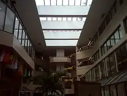 Construction began in early 1980 and the building itself was completed in May 1982 at a cost of $23,000,000.[2] The interior of the building consists of six floors of educational space and a seventh maintenance floor, altogether totaling 226,000 square feet (21,000 m2). While at the time the center was considered futuristic, a "dark spaceship" on the historic campus, it has since become incorporated into the campus with its Red Square courtyard serving as a student gathering area.[7]