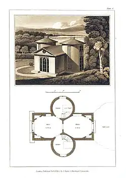 He also published two volumes of his designs for small buildings, Designs for Elegant Cottages and Small Villas, Calculated for the Comfort and Convenience of Persons of Moderate and of Ample Fortune (1806)[7] and Designs for Small Picturesque Cottages and Hunting Boxes (1807).[8] (see Hunting box.)